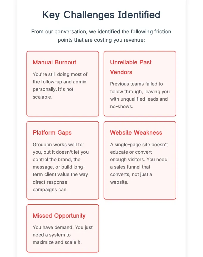 There's no catch. We provide tremendous value upfront because we're confident in our ability to help you scale. If we're a good fit and you want to work together after the session, great. If not, you still walk away with a clear roadmap to grow your med spa.